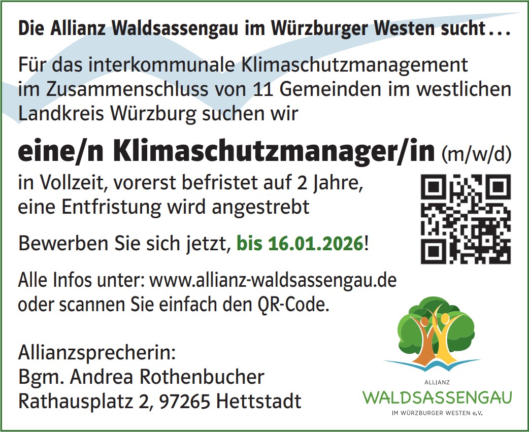 Die ILE Allianz Waldsassengau im Würzburger Westen e. V. ist ein Zusammenschluss aus 11 Gemeinden und 25.302 Einwohnern. Grundlage unserer gemeinsamen Arbeit ist ein Integriertes Ländliches Entwicklungskonzept (ILEK), welches seit Mai 2025 in der Fortschreibung umgesetzt wird. Das Handlungsfeld Energie, Klimaschutz/-anpassung ist von höchster Wichtigkeit für die nachhaltige Entwicklung unserer Region. Daher suchen wir Im Rahmen der Förderung von Erstvorhaben für Klimaschutzkonzepte und Klimaschutzmanagement zum nächstmöglichen Zeitpunkt zunächst befristet für zwei Jahre eine/n engagierte/n und motivierte/n Klimaschutzmanager/in (m/w/d)