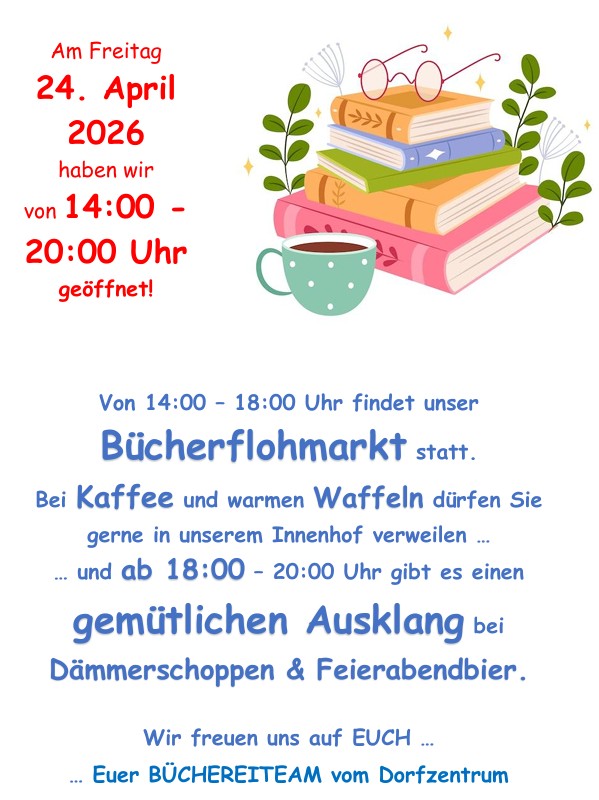die Bücherei ist am Dienstag, 21.04.2026 und Freitag, 15.05.2026 geschlossen