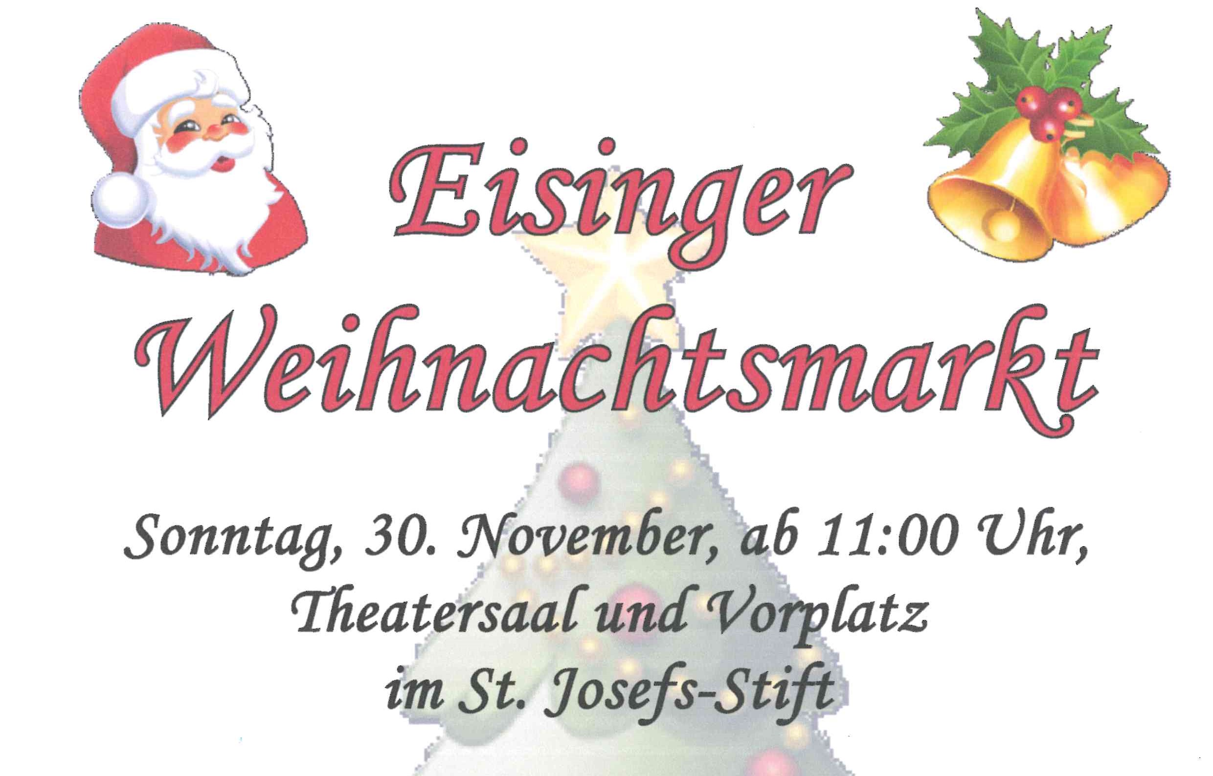 Am 1. Adventssonntag, 30.11.25, findet im St. Josefs-Stift der diesjährige Eisinger Weihnachtsmarkt statt. Nach dem Gottesdienst in der St. Josefskirche gibt es zwischen 11 und 18 Uhr allerlei Kreatives zu erwerben. Künstler und Kunsthandwerker aus Eisingen sowie dem St. Josefs-Stift bieten Adventskränze, Weihnachtsdekoration, Strickwaren, Pralinen, Liköre oder andere nützliche Dinge zum Verkauf an.